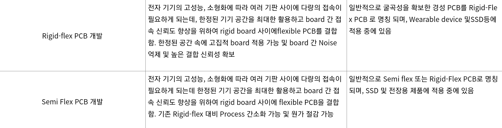 PCB부문을 먼저 볼게요. 요즘 IT기기들이 점점 소형화되면서 유연하기까지 해지고 있죠. 삼성전자의 폴더블폰을 떠올리면 될 것 같아요. 작으면서 유연하기까지해야한다? 더군다나 단단하기까지 해야겠죠. 기존 단단한 PCB를 Rigid PCB라 불렀고요. 유연한 PCB를 Flexible PCB라고 명칭했었는데요. 이 둘을 결합한 것은 RF-PCB라고 부릅니다. 즉, 두개의 장점을 합친 PCB인 것이죠. 코리아써키트의 연구실적을 보면 실제로 개발양산에 들어간 것을 알 수 있습니다.
