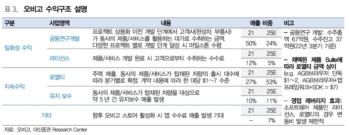 현재는 상용화 이전단계까지의 기술을 고객사한테 미리 판매하는 대가인 공동연구개발 매출 비중이 가장 크죠(50%). 하지만, 2025년인 중장기 목표를 보면, 점차 총 차량에 들어가는 오비고의 제품, 서비스에 대한 로열티 비중이 역전하는 것을 볼 수 있어요. 결국, 테슬라도 차량판매를 낮춰서 나중에 소프트웨어 구독비용으로 돈을 벌려고 하는 것처럼, 동사도 그런 비지니스 방향으로 갈 것 같습니다.