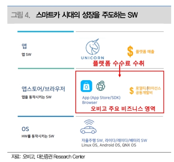 이전에는 차량의 하드웨어가 가치가 더 높았다면, 이제는 차량안에서 인포테인먼트나 IOT가 중요해지면서 소프트웨어가 더 높은 벨류를 받고 있습니다. 특히, 차량용 인포테인먼트는 다양한 디스플레이, 그 안에 상존하는 애플리케이션들이 주를 이루고 있는데요. 이에 대한 하나의 툴을 제공하는 오비고의 매출성장은 어느 정도 담보되어 있습니다. 특히, 수익구조를 보면 어떻게 오비고의 수익모델의 중요도가 변할지도 알 수 있는데요.