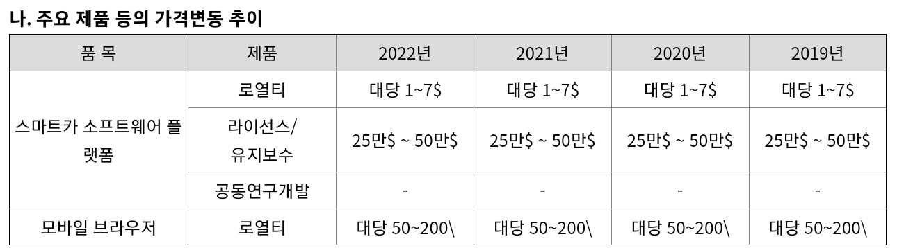 1. 차량용 OS : 미들웨어(AGB 브라우저, 앱 프레임워크, SDK) > 수익구조 : 로열티(대당 1~7$), 라이센스&유지보수(25만$~50만$), 공동연구개발(완성차OEM과 협업)