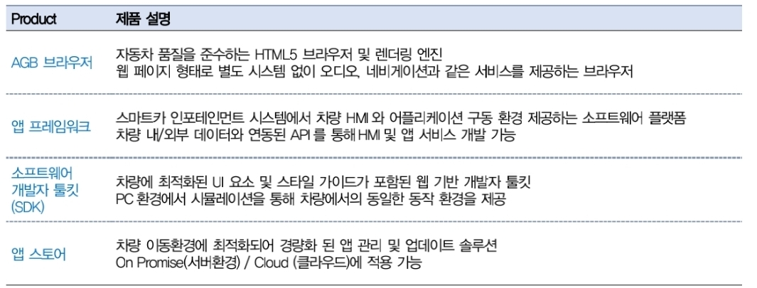 차량용앱 미들웨어(99%, AGB브라우저, 앱 프레임워크, SDK), 기타(1%, 모바일 브라우저) / 거래처 : 현대모비스, LG전자