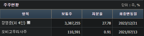 · 오버행 이슈로 2대 주주인 효림그룹 장병언 회장 지분 6%정도 있다.
