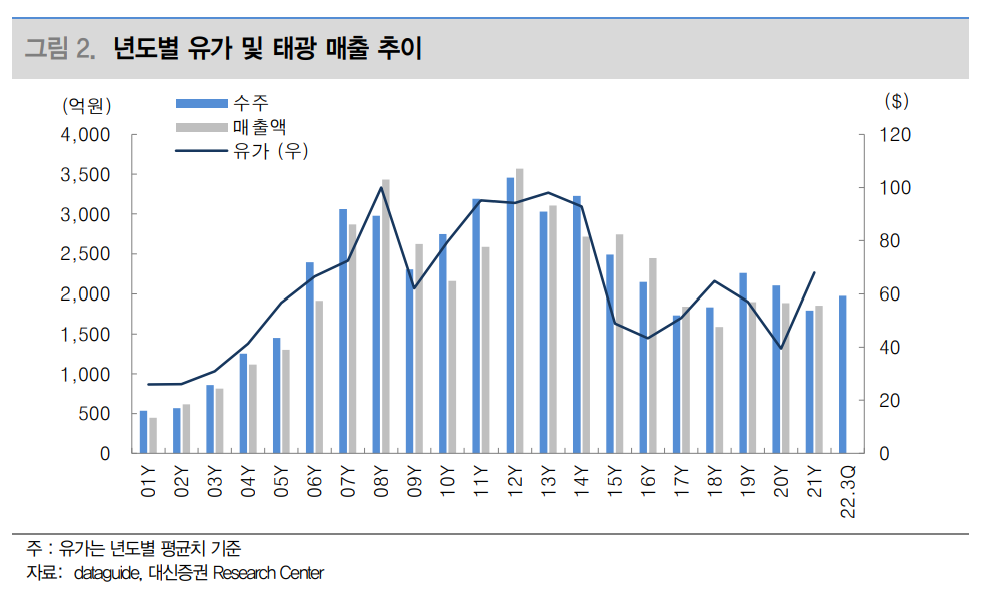 당연히, 글로벌 업체들은 유가가 높게 유지가 되면 수익성이 좋아지기 때문에 Capex를 늘리기 시작합니다. 그럼, 그대로 피팅업체들한테 수혜가 가겠죠. 태광의 주가를 보면, 원유와 연동한다고 해도 과장이 아닌 것을 볼 수 있어요.