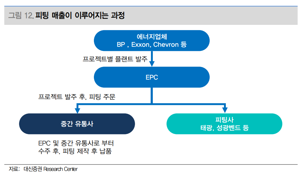 성광벤드의 매출구조는 다른 피팅업체들과 같습니다. Exon Mobile, Chevron, BP 등 세계적인 에너지업체들이EPC(플랜트)업체들에게 에너지건설 발주를 먼저 줍니다. 그러면, EPC 업체는 프로젝트를 시행하면서 태광 같은 피팅업체에 주문을 넣는 것이죠. 이때, 피팅업체들은 EPC에 직접 납품하거나 유통사를 통해 판매를 합니다. 참고로, 대표적인 EPC업체들은 삼성엔지니어링, 삼성중공업, 현대중공업, 현대건설, GS건설, DL이엔씨 등이 있어요.