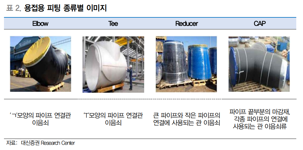 용접용 피팅의 종류를 살펴보죠. 배관의 방향을 바꾸는 Elbow. 배관을 나눌 때 사용하는 Tee. 크기 차이를 맞춰주는 Reducer. 파이프의 마감재 CAP 등이 있어요. 대표적인 4가지 이지만, 피팅부품은 기성품이 아닌 수주품인 관계로 사실상 종류로만 9만 가지가 넘습니다. 그렇기 때문에, 프로젝트 규모나 재질에 따라 ASP 차이가 상당히 많이 나죠.