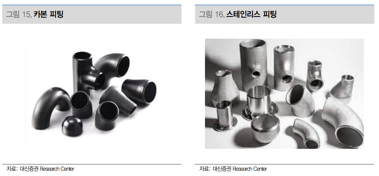 피팅도 재질별로 나뉘어지는데요. 카본, STS(스테인리스), 합금강이에요. 디케이락은 주로 스테인리스를 주로 생산하고 있어요. STS로 만들어진 피팅은 주로 저온유지가 중요한 LNG, 석유화학, 해양플랜트 등에 쓰입니다. 카본은 주로 정유 쪽에서 많이 쓰여요. ASP는 STS 피팅이 더 높습니다.
