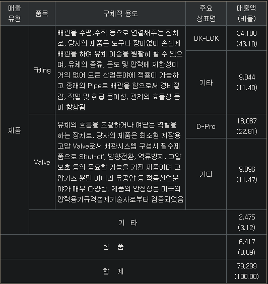 계장용피팅(55%), 밸브(34%), 기타(11%)