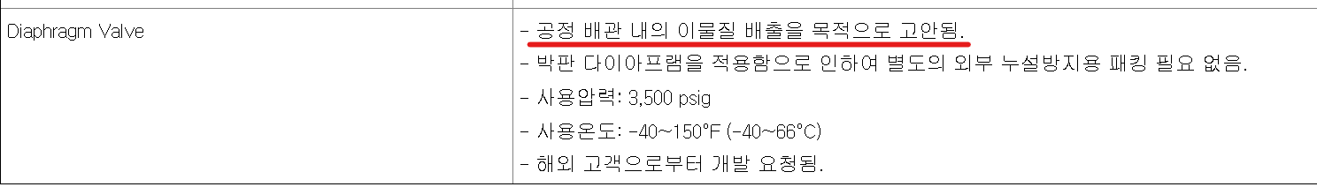 벨브도 마찬가지로 사용압력, 사용온도가 중요합니다. 벨브 연구개발을 보면 한 가지 특징이 배관의 이물질을 배출하기 위해 R&D 투자한 것으로 나와있습니다. 석유, 가스 같은 유체가 흘러가다 보면 자연에서 같이 빨려들어온 미생물 같은 것들도 오기 때문에 배관에 쌓일 수도 있겠죠. 디케이락은 그걸 방지하기 위한 이물질 배출 벨브를 개발했습니다.