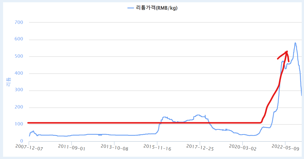 사실, 리튬이 주목받기 시작한 것은 불과 2~3년 밖에 되지않았어요. 본격적인 전기차시대가 등장하면서 리튬에 대한 중요성도 부각되기 시작했죠. 밑에 차트는 리튬가격추이 그래프인데요. 2000년대만 보더라도 근 20여년간은 리튬가격은 눌려있었어요. 그저 값싼 광물에 불과했죠. 그러다가, 코로나가 터지고 친환경에 대한 중요성이 부각되자 리튬가격이 6배이상 오르기 시작합니다.