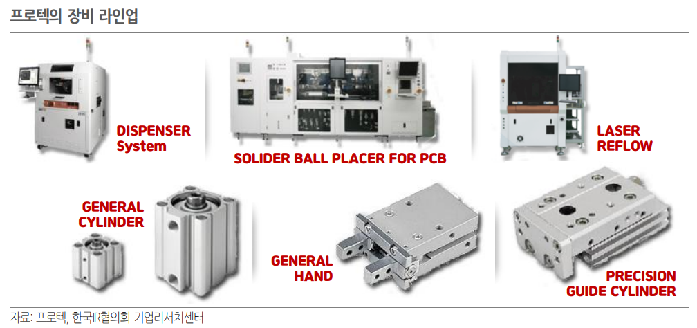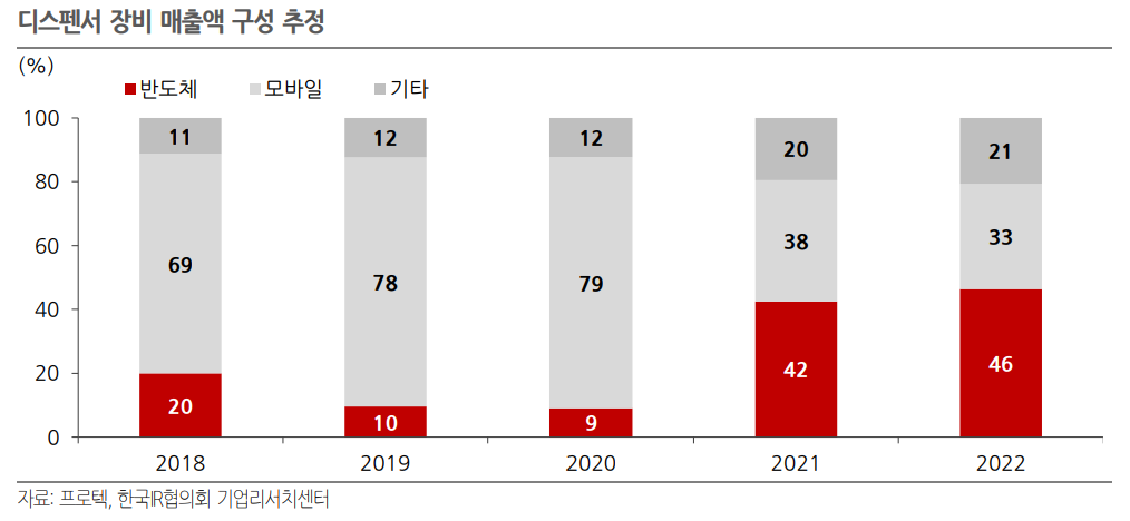 참고로, 디스펜서장비는 전세계적으로 독과점체제인데요. 미국의 노드슨이라는 장비업체가 미국, 유럽 포함한 50% M/S 차지하고 있고요. 그 다음이 일본의 무사시 엔지니어링입니다. 3위는 동사인 프로텍으로써 글로벌 M/S 10~15% 예상하고 있습니다. 또한, 디스펜서는 반도체에만 쓰이는 것이 아니라 스마트폰용, LED용 장비군에도 쓰여요. 비중으로 따지면, 반도체 46.4%, 스마트폰33%, LED 20.6%입니다.