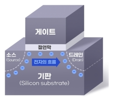 우선, 트랜지스터는 전압을 들여보내는 입구역할을 하는 '게이트(gate), 전하를 공급하는 소스(source), 전하를 배출하는 드레인(drain)으로 구성됩니다. 구체적인 작동원리를 살펴보면, 게이트에 전압을 걸어주면, 소스와 드레인 사이에 전하가 모여 '채널'이라는 것을 형성하게 되는데요. 채널(Channel)은 일종의 다리 역할을 한다고 생각하면 되요.
