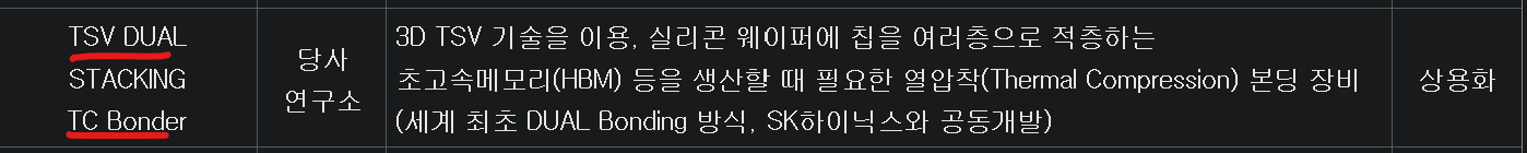앞서서 TSV TC Bonder장비를 배웠죠. Chat GPT 처럼 초거대 AI가 주목받으며 메모리의 급격한 성능향상 요구가 생겨났고, 대안으로 HBM이 나왔어요. 이 HBM은 기존 와이어본딩 방식보다는 높은 아파트를 한 기둥으로 직선으로 이으면 더 빠르고 효율적이라고 했죠. 이러한 기둥을 열압착 방식(TC, Thermal Compression)으로 본딩하는 장비를 한미반도체가 공급합니다. 아래 R&D에서도 나와있네요.