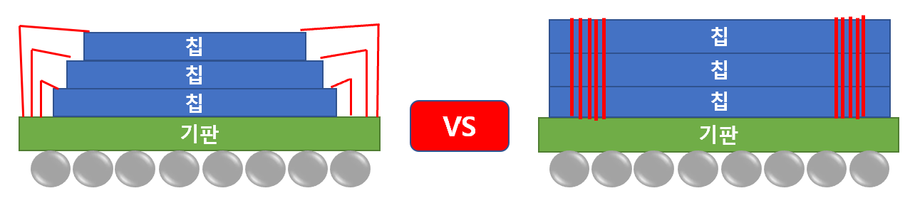 문제는 점점 반도체 칩이 쌓여가는 개수가 많아지다보니 전극을 기존 와이어방식으로 본딩하던 것은 한계가 있어요. 아래 그림을 보면, 왼쪽이 와이어본딩 방식인데요. 한개의 칩을 기판에 연결하고 다시 다른 칩을 기판에 연결하다보니 전극이 놓일 자리가 남아나질 않아요. 또한, 전극의 길이가 점차 길어지면서 데이터전송 속도도 느려지게 되죠.
