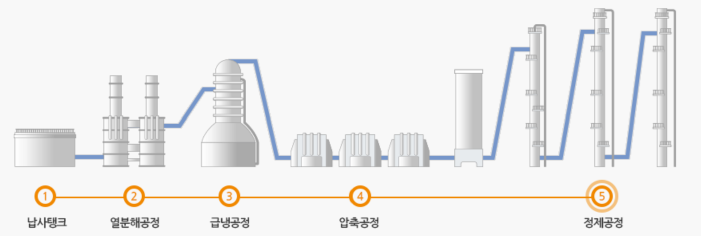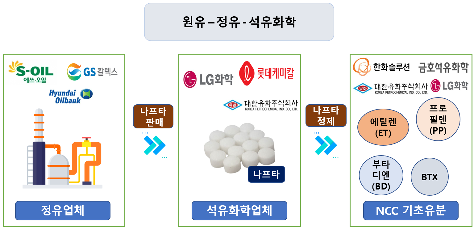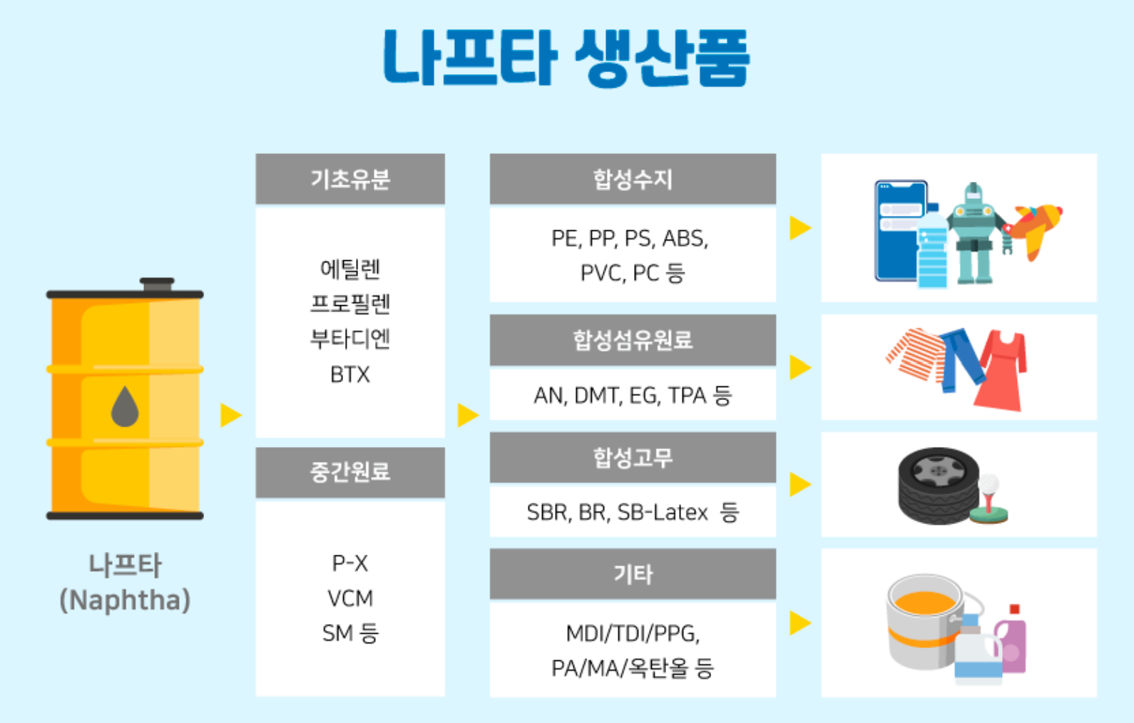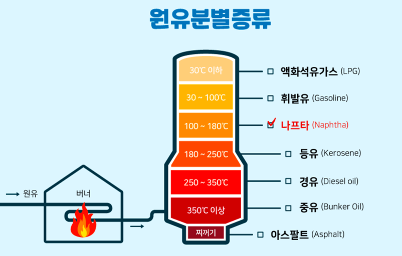 원유는 끓는 점에 따라 LPG ~ 중유로 나뉘는데. 석유화학업체들은 100~180도에서 나오는 '나프타'를 정제 및 가공하여 화학제품을 위한 기초원료를 생산하죠.