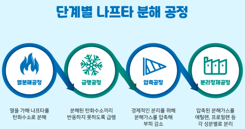 나프타를 가져온 석유화학사들은 나프타 분해시설인 NCC를 통해 다양한 화학원료를 얻습니다.
