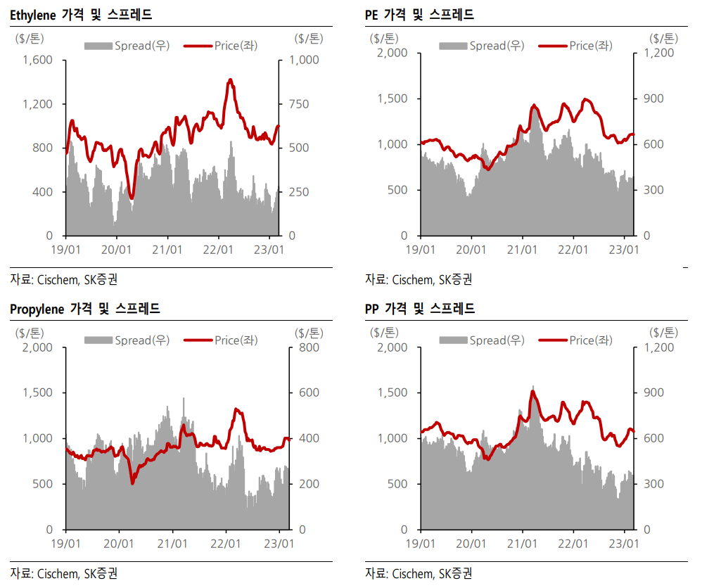 그럼, 이제 증권사 애널리스트들이 매주 발표하는 석유화학소재 스프레드를 해석할 수 있을겁니다. 기초원료인Ehylene(에틸렌)의 가격이 23.1월에 상승했죠. 그러다보니, 에틸렌으로 만들어지는 PE 가격도 덩달아 상승했습니다. 이는 PE가 주력인 롯데케미칼, 대한유화의 매출액 증대로 이어질 수 있죠. 물론, 가격만 상승한다고 수익성이 좋아지는 것은 아니에요. 수요가 받쳐줘야하기 때문이죠. 다만, 이러한 스프레드를 참고용으로 보면서 투자할 수 있다는거에요.