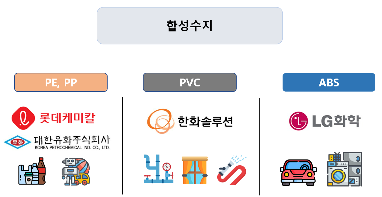 마지막으로는 ABS에요. ABS는 Acrylonitrile-Butadiene-Styrene의 줄임말로, 이름처럼 아크릴로니트릴(A), 부타디엔(B), 스타이렌(S)의 합성수지입니다. 그냥 ABS라고 부르자고요. ABS의 특징은 다른 합성수지보다 열이나 충격에 강하다는 장점이 있는데요. 그러다 보니, 무겁고 값비싼 제품에 주로 쓰여요. 가전제품이나 자동차 내외장소재로 주로 쓰이죠. 이건 누가할까요? 바로 LG전자와 연관있는 LG화학이 합니다. 왜 LG화학이 ABS를 하는지 이제 이해가 될거에요. PE, PP, PVC, ABS 쓰임새와 주력 회사들을 아래 그림에 정리해놨습니다.