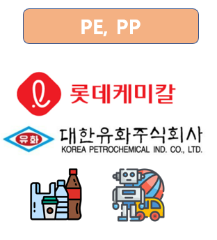 합성수지에 속해있는 소재들은 각자 역할이 조금씩 다른데요. PE(폴리에틸렌)는 일상생활에서 가장 많이 접할 수 있는 소재인데요. 인체에 무해하고 방수기능, 전기절연성까지 갖춰서 일회용 플라스틱, 식품용기, 장난감 등에 주로 쓰여요. PP(폴리프로필렌)은 환경호르몬을 배출하지않아 플라스틱 중에서는 가장 환경친화적인데요. 그래서, 음식물 담는 용기부터 우리몸에 닿는 의료기기까지 쓰이고 있어요. PE, PP 사용이 갑자기 증가한다?(그럴 가능성은 적어보이지만) 그러면, PE, PP의 비중이 높은 롯데케미칼, 대한유화를 눈여겨 봐야합니다.