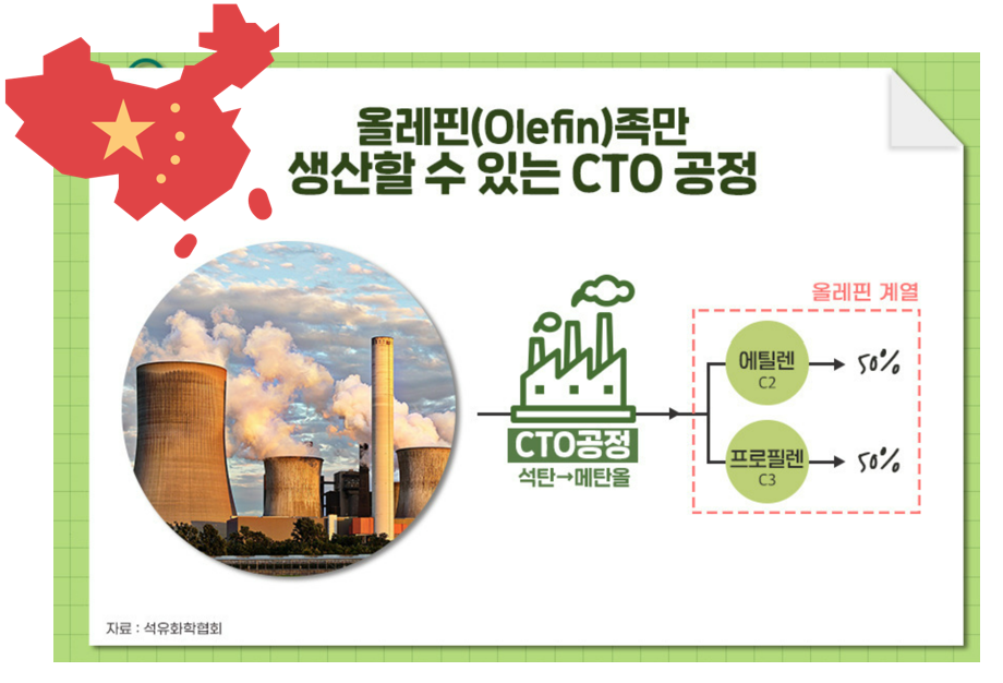 하지만, 이제 미국과 어깨를 나란히 하는 중국도 석유화학제품을 스스로 만들 수 있게 되었어요. 그러다 보니, 그동안 중국 수혜를 받았던 국내 석유화학업체들에게 비상등이 켜졌습니다. 중국의 석유화학제품 생산방식은 NCC가 아닌 CTO라고 하는데요. 중국은 석탄 매장량 + 수입량이 압도적인 국가이죠. 그러다 보니, 석탄을 통해서 석유화학제품을 만드는데요. 그래서, CTO의 약자가 Coal(석탄에서) To Olefin(에틸렌, 프로필렌 = 올레핀족)이란 뜻이에요. 정확히 말하면, 석탄에서 메탄올을 만들고 이 메탄올을 통해 에틸렌, 프로필렌을 만듭니다.