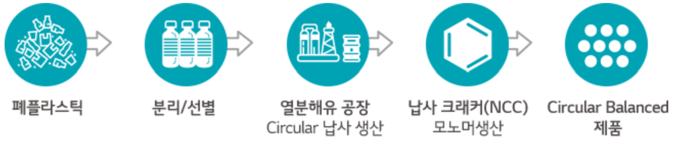 기계적방식으로 재활용했던 PCR방식과는 다르게 화학적 공법에서는 열분해를 합니다. 합성수지의 원재료는 나프타이죠. 나프타의 원재료는 원유이고요. 아직, '석유화학제품 어떻게 만들어지는가'를 안본 독자들이 있다면, 보고오면 이해가 쉬울거에요. 아무튼, 결국 나프타로 만들어진 플라스틱을 다시 열분해하면 나프타로 돌아가겠죠. 이것이 핵심입니다. 위 그림을 보면 알겠지만, 납사(=나프타)를 다시 재생산하고 있는 것을 알 수 있어요. 기존에는 플라스틱을 버렸다면, 기술발전이되어서 다시 사용할 수 있게 된 것이죠.