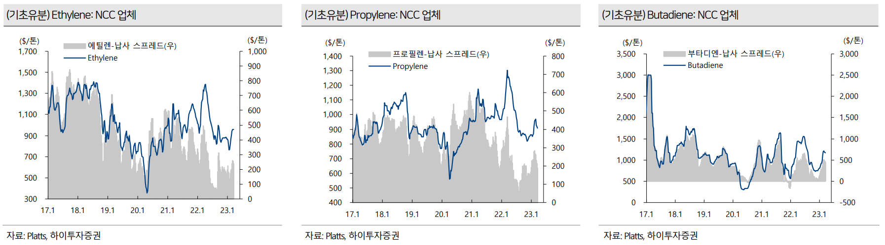 파란색선은 에틸렌가격이에요. 첫 번째 그래프를 보면, 에틸렌 가격이 오르면 스프레드도 상승하는 것을 알 수 있어요. 여기서 스프레드란, NCC업체가 납사(나프타)를 들여왔을 때 구매한 금액과 이 납사를 가공하여 에틸렌을 만들어 판매한 가격의 차이에요. 즉, 스프레드 마진 = '에틸렌 가격 - 나프타 가격'인 것이죠. 스프레드(회색선)가 올라가면 갈 수록 에틸랜(판매가격)과 나프타(원재료 구매가격)이 벌어졌다는 것이니 마진이 많이 남았겠죠. 여기서 흥미로운 점은 LG화학, 롯데케미칼 같은 대표 NCC업체들은 보통 나프타 가격을 비싸게 주고 사와야 기초원료를 더 비싼 프리미엄가격으로 팔기 때문에 나프타 가격이 오르는 것을 선호한다는 것입니다.