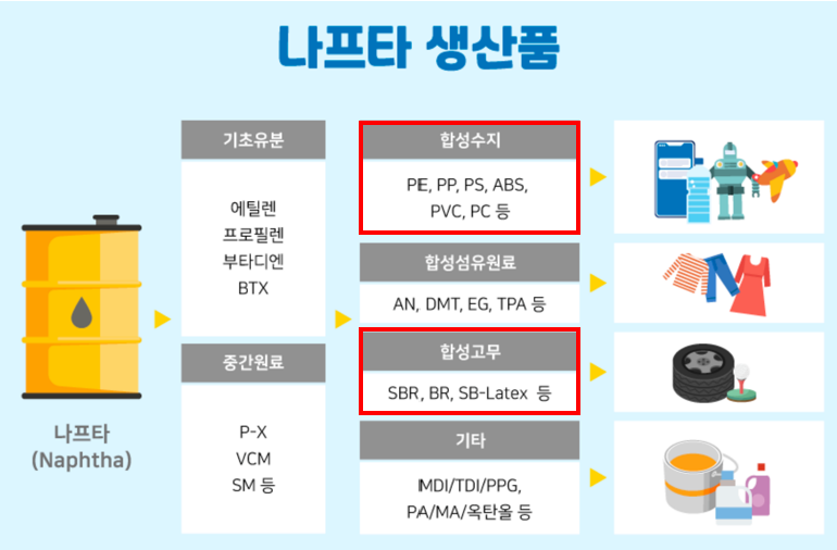 사우디 같은 산유국들이 정유과정을 생략하고 바로 나프타를 생산할 수 있는 공법을 개발해냈죠. 그러면, 급격하게 NCC가 증가하게 됩니다(NCC공법 쉽게보기). NCC(Naphtha Cracking Center) 작업을 해서 기초원료를 만들던 업스트림업체인 LG화학이나 롯데케미칼 같은 경우 NCC공급사가 증가하게 되어 기초원료 ASP가 급격하게 줄어들기 시작하겠죠. 반대로, NCC업체를 통해 만들어진 기초원재료를 사다가 합성수지, 합성섬유, 합성고무로 만드는 금호석유 같은 업체들에게는 저렴한 원재료비용이 되어 원가비용을 확연히 낮출 수 있게 됩니다.