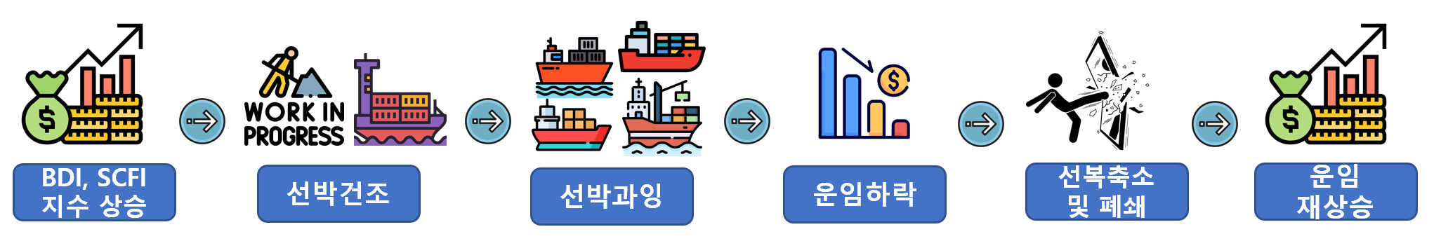 사실, 조선업, 해운업은 굉장히 싸이클을 많이 타는 산업이에요. 예를 들면, 전 세계적으로 경기가 활성화되면 여러 물자들이 운반되겠죠. 해상운임이 가성비가 가장 뛰어나 물품의 90% 이상이 선박을 통해 전세계 물자들이 이동하고 있을 정도에요. 자연스레 해운이 바빠지면 BDI지수(발틱해 건화물 지수), SCFI(상하이 컨테이너 지수)가 올라갑니다. 그러면, 선주들은 선박을 더 짓겠죠. 운행을 더 많이하면 돈을 더 버니깐요. 그런데, 혼자 선박을 늘리는게 아니에요. 너도 나도 선주들이 선박을 늘리기 시작합니다. 그 결과, 시장에 선박공급과잉이 나타나고 해상운임이 떨어져 수익률이 떨어지게 됩니다. 그러면, 선주들은 감가상각이 억단위로 되는 선박을 축소하거나 폐쇄하기 시작합니다. 그러다 다시 경기가 좋아지면, 선박이 부족해져 해상운임이 오르고 다시 싸이클을 반복하는 식인 것이죠.