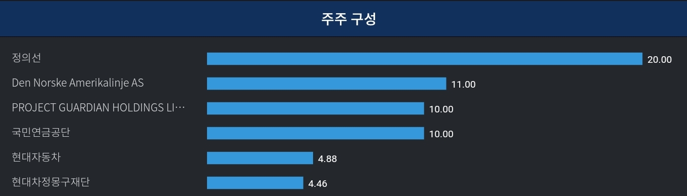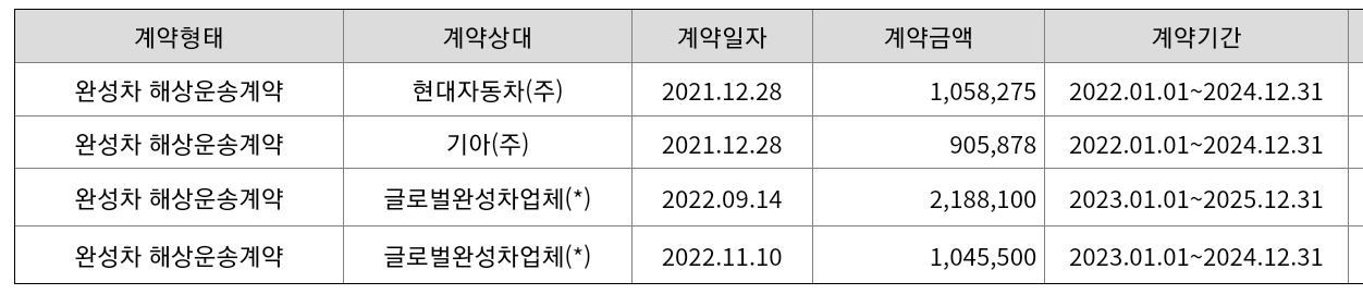 · 해운업(16.94%) : 완성차(현대차, 기아차), 벌크(석탄, 철광석, 건어물 등) , 탱커선(LNG, 원유)운송, 컨테이너선
