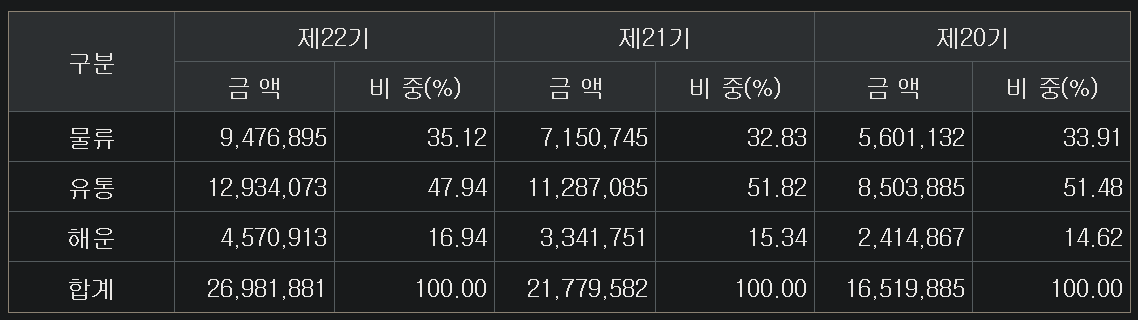 · 종합물류(35.12%) : 운송-보관-하역 모든 서비스를 제공하는 사업