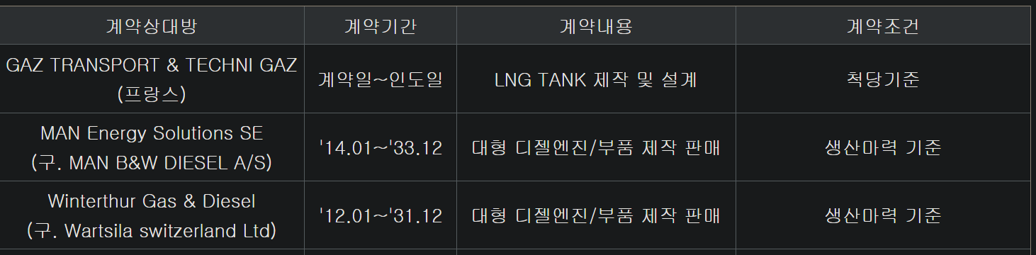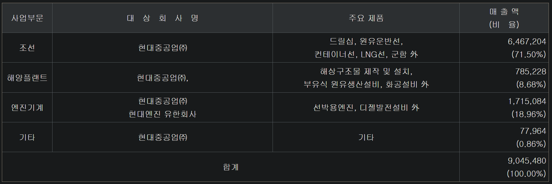 · 엔진(18.96%) : 대형엔진 라인센스 구매후 제작(선박용 엔진), 중형엔진 HiMSEN 브랜드 (발전용, 여객선, 관공선용)