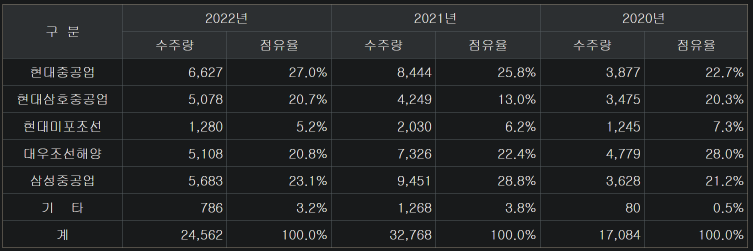 · 조선(71.5%) : 컨테이너선, LNG선, 탱커선, 군함