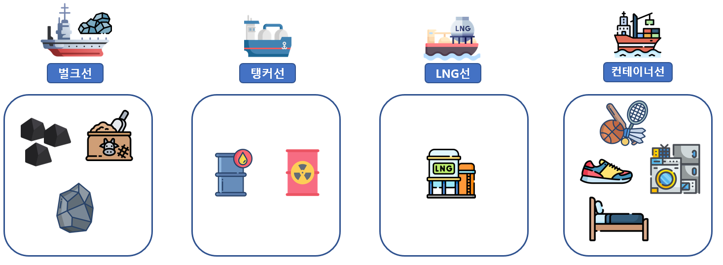 조선업은 배를 만드는 일을 하는거죠. 현대중공업은 벌크선, 탱커선, 컨테이너선, LNG선 왠만한 배들은 전부 만들 줄 알아요. 지난 번에 제가 올린 '현대글로비스 자동차나르며 수익상승'과 '팬오션의 벌크선 쉽게보기'를 보고왔다면, 어떻게 선주들이 이 배들을 갖고 돈을 버는지 이해했을거에요. 아래 그림은 각 선박별로 무엇을 실으는지 정리한 것이니 참고하면 됩니다. 추가적으로 군함도 만듭니다.
