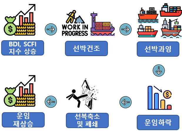 해상운송업은 반도체와 같이 싸이클 산업인데요. 만일, BDI, SCFI 같은 해상운임지수가 상승하면, 더 많은 선박을 운영하기 위해 해운사들이 조선사들에게 주문을 넣기 시작합니다. 그러면, 선박공급이 늘어나겠죠. 그러면, 자연스레 시장논리에 의해 해상운임가격이 떨어져요. 그러면, 들고만 있으면 주차비용, 감가상각, 정비비용까지 억단위의 돈이 드는 선박을 폐쇄하거나 축소하기 시작합니다. 그러면 다시 선박공급이 줄겠죠. 다시 해상운임이 상승하면서 싸이클을 반복하게 됩니다. 아래 그림으로 정리해놨어요.