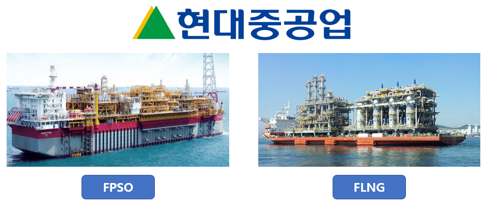 해양플랜트에 대한 시추설비, 생산설비는 '해양플랜트 한 번에 끝내기'를 참고하면 바로 이해하실 수 있을 거에요. 글을 보고왔다면 FPSO가 뭔지 이해하고 있을텐데요. 아래 사진은 현대중공업이 직접 세운 FPSO와 FLNG입니다.