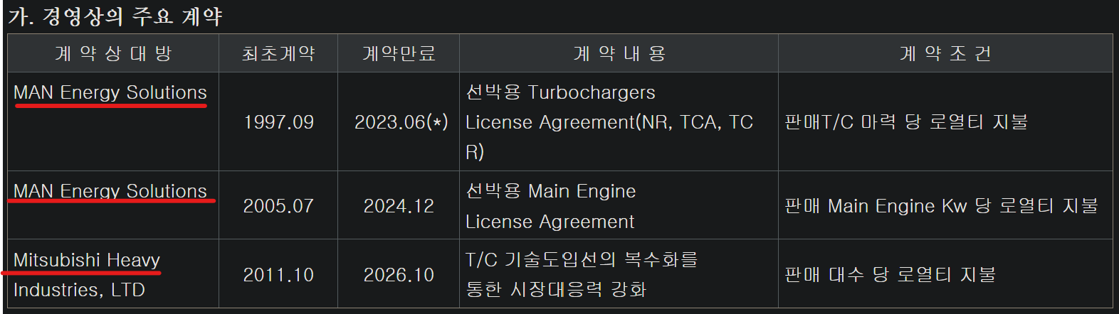 아래 표를 한 번 봐볼까요. 앞서 언급한, 덴마크 엔진기술사인 MAN -ES사의 선박용 터보차저와 선박용 엔진 라이센스 계약을 맺은 것을 확인할 수 있습니다. 로열티를 계속 지불하면서 사용하고 있는 것을 알 수 있어요. 이는 현대중공업, HSD엔진 다른 업체 모두 예외없이 대형엔진(저속엔진)에서는 로열티를 지불하며 제작하고 있습니다.