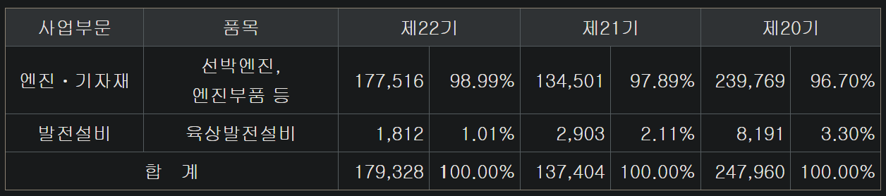 · 선박용 엔진 : 대형엔진(저속엔진, 대형선박), DF엔진(메탄-LPG 개발), 가스엔진(LNG, LPG)