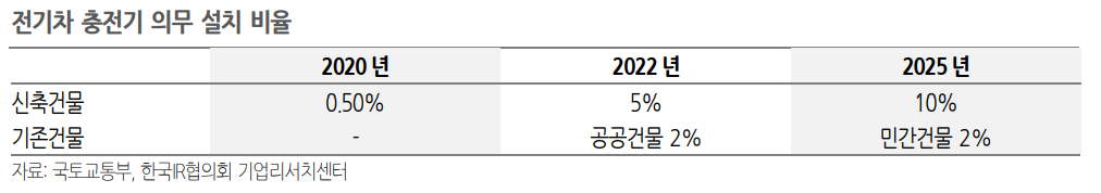 국내에서도 정부가 정부가 신축건물, 기존건물로 나눠서 공공기관부터 전기차 충전기 의무설치 비율을 추세적으로 늘리고 있어서, 전기차 충전소 수요는 꾸준히 증가할 것 같아요.