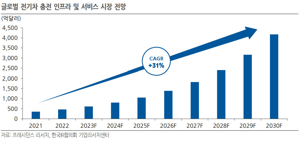 전기차 충전기는 충전속도에 따라 초급속(300~350kW), 급속(50~200kW), 완속(3~7kW)로 나뉘는데요. 동사는 3개 모두 Capa 능력을 보유하고 있습니다. 무엇보다, 전기차 충전소는 앞으로의 CAGR 커진다는 것이 가장 큰 장점이 아닐 까 싶습니다. 글로벌적으로 보면, 2030년까지 무려 CAGR +31%을 예상하고 있으니깐요.