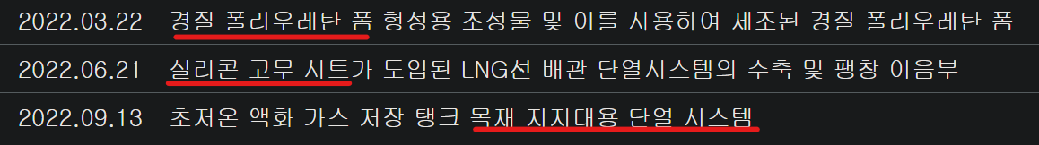 아래 표는 가장 최근 동성화인텍이 특허출허한 것입니다. 경질은 단단하다는 뜻인데요. 한 번 가공을 마치면 재가공 할 수가 없다는 것이 특징이죠(vs. 연질). 폴리우레탄폼이 온도를 유지시켜주는 단단한 역할을 해야하니 연질보다는 경질 폴리우레탄폼 R&D를 한 것으로 보이네요. 그 다음은 LNG선 배관 이음부에 쓰이는 실리콘 고무인데요. 실리콘, 고무 둘다 공통점이 있죠. 유연하면서도 열에 강하다는 것입니다. LNG 처럼 온도에 예민한 물질에 잘 알맞기 때문에 쓰는 것 같네요. 그 다음은 가스저장탱크를 지지하는 목재 지지대 단열시스템인데. 왜 목재를 썼을까요? 제 생각에는 나무는 열 전도성이 없기 때문이죠. 뜨거운 여름 철봉을 만질 때랑 나무를 만질 때 확연한 차이가 있듯이 말이죠.