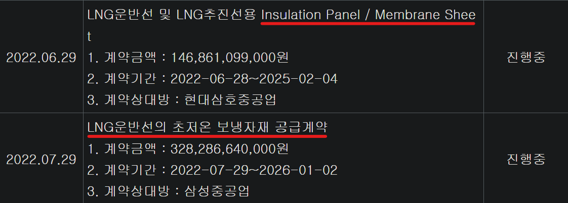 아래 표는 수주를 따낸 공시인데요. 수주기록을 보면, 동사가 어떤 것을 주력으로 판매하는지 알 수 있기 때문에 가져와봤어요. Insulation Panel(단열재), Membrane Sheet(멤브레인)를 현대삼호중공업과 계약을 맺었네요. 그 아래는 삼성중공업과 초저온 보냉재 계약을 맺었구요. 여기서 주목할 것은 폴리우레탄폼 뿐만 아니라 멤브레인, 단열재까지 공급한다는 것입니다. 아까, 보냉재 구성요소을 기억해보면, 내벽에 멤브레인, 외벽 콘크리트, 내외벽 사이 폴리우레탄폼을 기억해보면 좋을 것 같습니다.