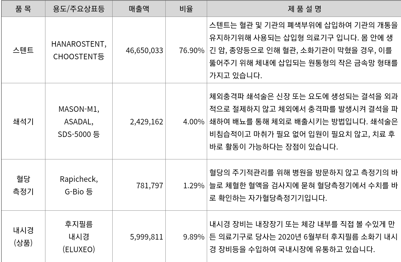 국내 경쟁사로는 휴온스메디컬, 에이치엔티메디칼이 있구요. 해외 경쟁사로는 독일, 프랑스, 이스라엘 업체들이 다수 있습니다. 동사를 포함한 국내 경쟁사들은 중저가 '체외 충격파 쇄석기'를 판매하고 있어요.