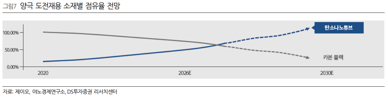 * 기능 : 기존 카본블랙보다 적은 양으로 활물질의 전자를 집전체로 이동 빠르게 > 에너지밀도, 충방전, 방열효과 증가
