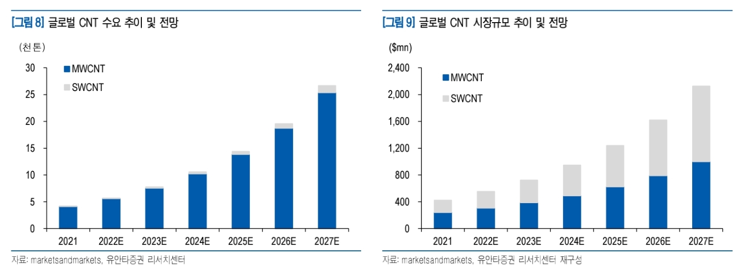 · CNT(Carbon Nano Tube) 도전재 : TWCNT(Thin Wall CNT, 음극재), MWCNT(Multi Wall CNT, 양극재)