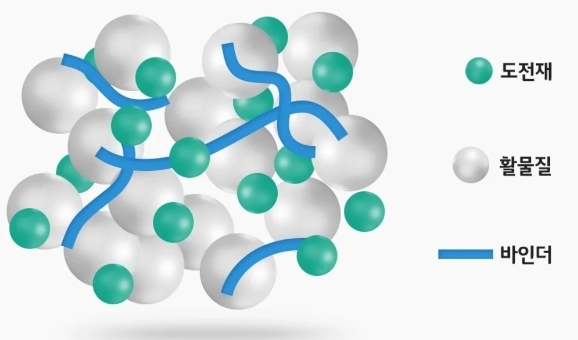 아래 그림은 활물질+도전재+바인더로 구성되어있다는 것을 보여줍니다.