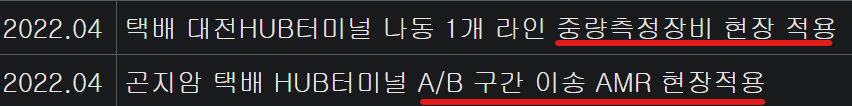 풀필먼트에 대한 연구가 많은데요. 처음 체적측정기로 상품 중량을 계산한 것과 픽킹작업이 끝난 상품과 비교를 해서, 중량이 일치하면 패스하는 작업을 중량측정장비가 한다고 했죠. 대전HUB터미널에 적용한 것을 알 수 있네요. 또한, 메가허브 터미널이라 불리는 곤지암HUB에서 AMR 적용을 한 것을 알 수 있습니다. AMR은 '풀필먼트 3분이해'에서도 설명했듯, AGV와는 다른 개념인데요. AGV(Automated Guided Vehicle, 자동지정기기)가 지정된 경로만 갔다면, AMR(Autonomous Mobile Robots)은 스스로 길을 찾아서 이동한다고 했어요. AMR 역시 곤지암HUB에 적용을 했네요.