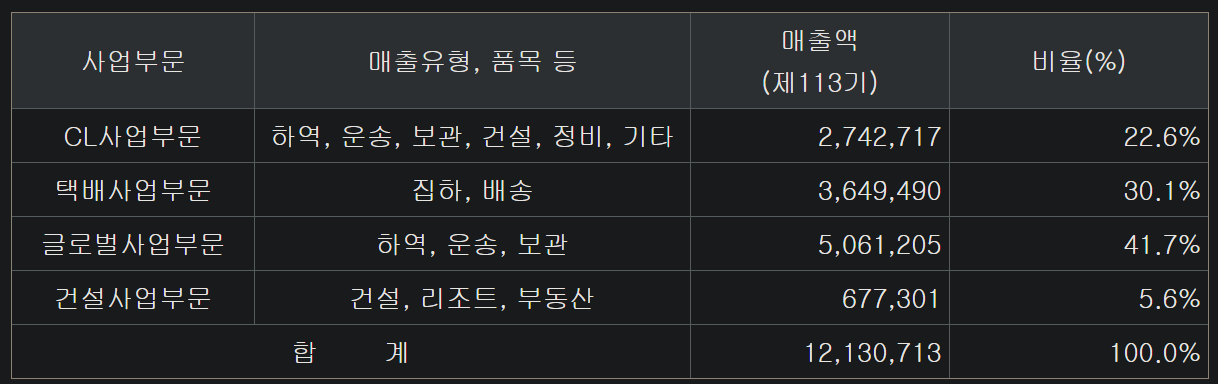 CJ대한통운의 사업은 크게 4가지로 분류할 수 있는데요. 1. CL(Contract Logistics, 계약물류), 2. 택배, 3. 글로벌, 4. 건설입니다. 1. CL은 계약형태로 W&D, P&D로 나눌 수 있는데요. 화주의 물건을 보관(Warehousing)하고 운송(Delivery)하는 것이 W&D(소비자상품, 리테일, 제약, D2C 등 다양). 정부의 항만부두권 운영권을 승인받아 항만하역(Port)와 운송(Delivery)하는 것이 P&D입니다. 자체 선박 4척(컨테이너선, 벌크선)을 갖고 있기에 직접 해운업도 합니다. 2. 택배는 자주문부터 출고까지 자동화를 실현하는 풀필먼트서비스를 메가허브터미널(Ex, 곤지암허브터미널)에 구축함으로써 익일배송, 당일배송, 새벽배송 그리고 LMD(Last Mile Delivery)까지 오네(O-NE) 신규 브랜드로 사업하고 있습니다. 3. 글로벌은 전 세계 CBE(Cross Border E-commerce, 국경간 전자상거래) 시장이 커짐에 따라 구매자의 가까운 지역에 물류센터(GDC, Global Distribution Center)를 세워 2~3일 안에 배송하는 시스템을 만드는 것입니다. 또한, 포워딩이라는 해상 포워딩, 항공 포워딩 등 해운+항공운송을 하면서 수출입, 통관까지 한 번에 배송할 수 있는 인프라를 갖추는 사업입니다. 4. 부동산은 골프장, 리조트 등을 짓습니다.