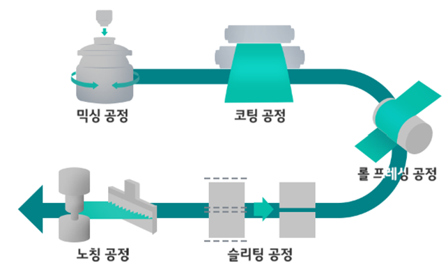 이차전지전극소재는 '전극공정'에서 이루어지겠죠. 전극 공정은 원통형, 파우치형, 각형 상관없이 똑같다고 보면 되는데요. 양극재를 예시로 설명할게요. NCM이라고 하면, 처음 합쳐지지않은 N, C, M을 섞어주는 믹싱공정을 해줍니다. 끈적한 슬러리(Slurry)가 만들어지죠. 그리고, 양극재 집전체인 알루미늄판에 도포해줍니다(코팅 공정). 도포를 완료화면, 롤프레싱 장비로 딱 달라붙게 압착을 해야하는데, 슬러리가 끈적하다고 했죠? 그래서 중간에 건조과정이 들어가요. 건조가 완료되면, 롤프레싱 장비로 압착해주죠(에너지 밀도 상승). 그리고, 용도에 맞게 가로로 잘라주고요(슬리팅공정). 마지막, 세로로 까지 잘라주면(노칭공정) 전극공정은 완성입니다.