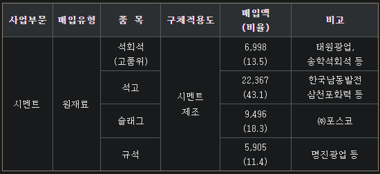 시멘트는 석회석, 석고, 슬래그, 규석 등이 원재료에요. 아래 표에 석회석에 고품위라고 적혀있는 것은 순도가 높은 석회석을 뜻합니다.