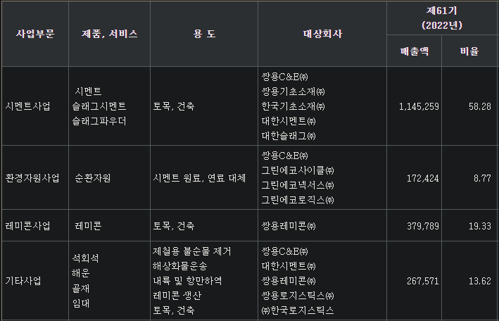 · 환경자원사업 : 폐합성수지, 폐타이어, 석탄재(점토 대체) 등 시멘트 원료로 재탄생