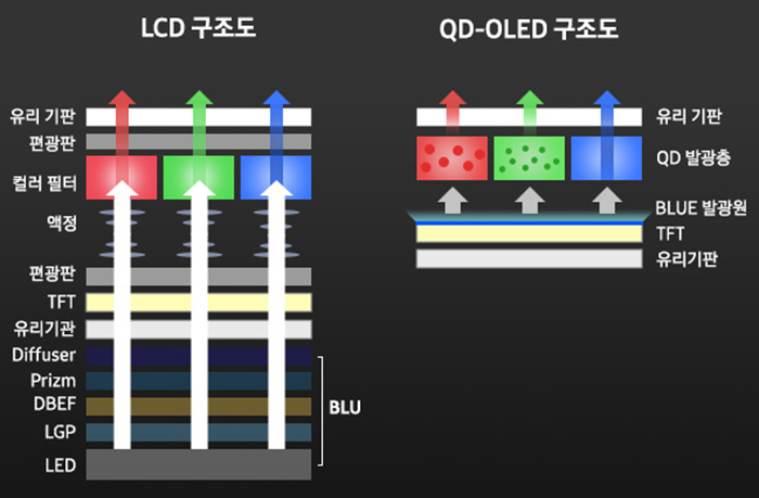 퀀텀이란 단어를 들어봤나요? 퀀텀(Quantam)은 더 이상 나눌 수 없는 최소단위를 뜻해요. 즉, 정말 작은 것을 의미하죠. 퀀텀들이 점단위로 여러 개 뭉쳐있는 것이 퀀텀닷(Quantum Dot)인데요. 이 퀀텀닷이 발광층 역할을 해서 뒤에서 발광을 내는 강한 블루라이트를 이용할 수 있기 때문에 더 밝은 휘도(단위면적당 밝기) 표현이 가능하다는 것이 특징이에요.